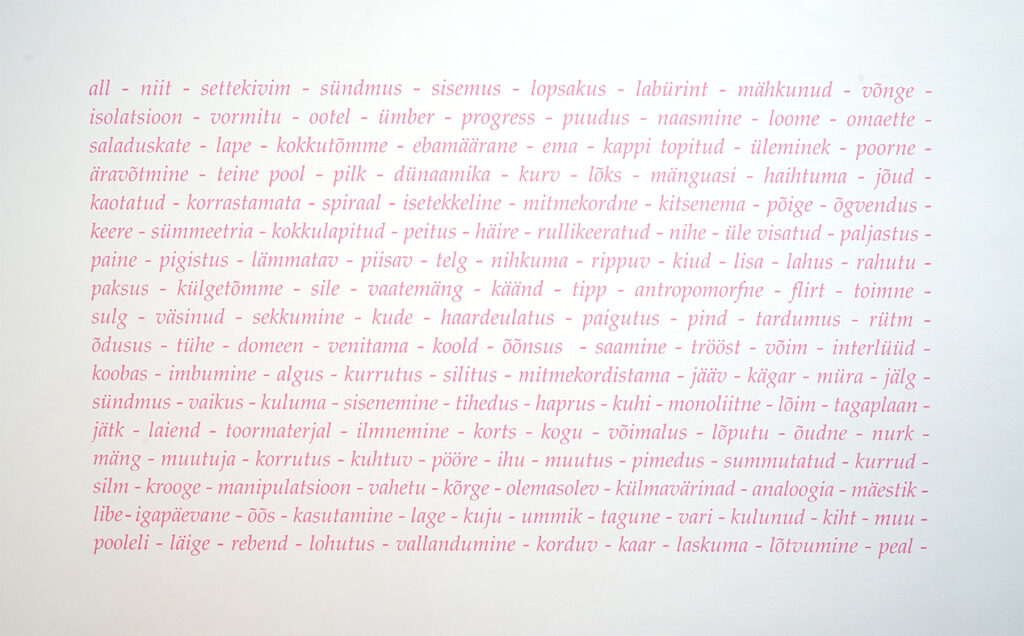 „Sõna —- pilt —- kujutlus. Kas iga sõna eraldi või reana koos. Sõna eraldi ja reana koos. Ruum hajub tervikmõtteks või üksikuteks piltideks…