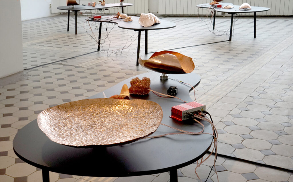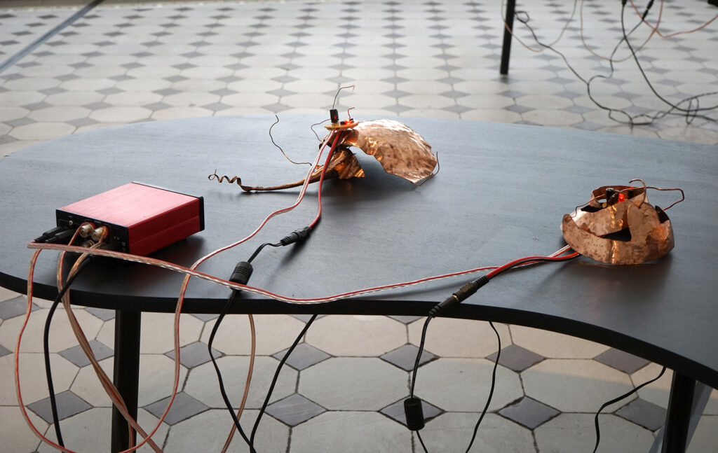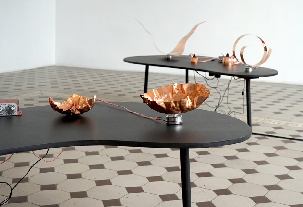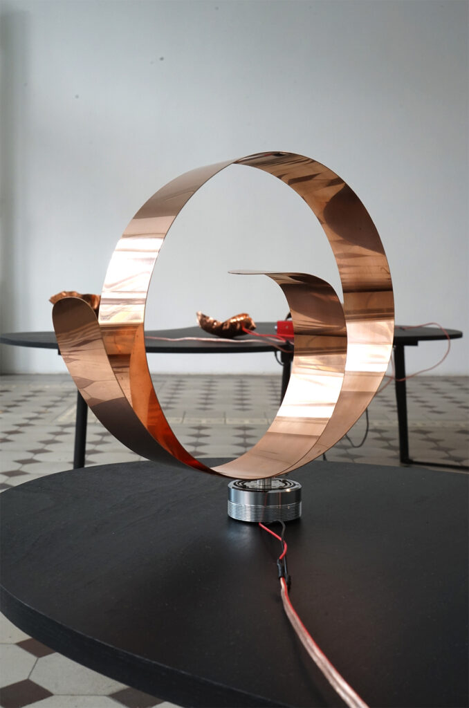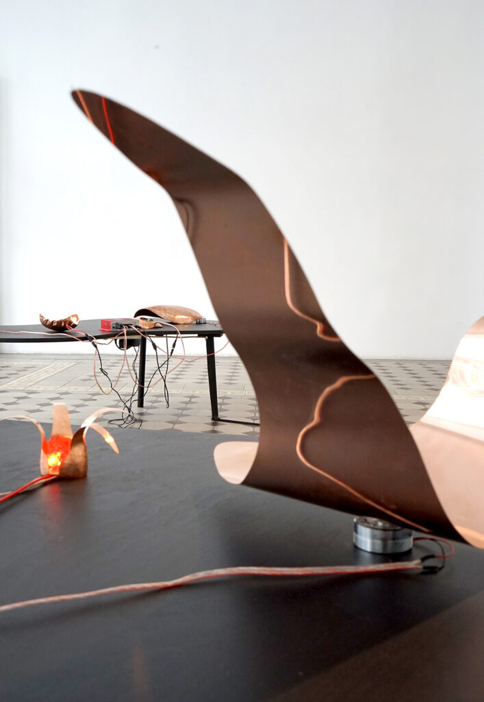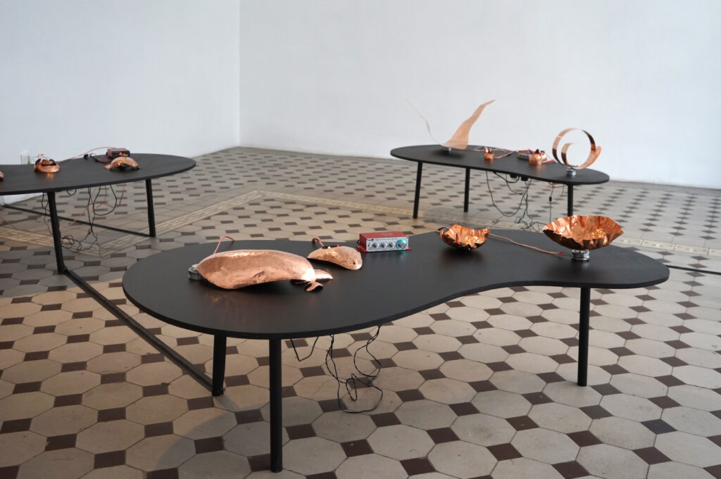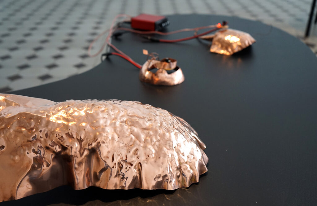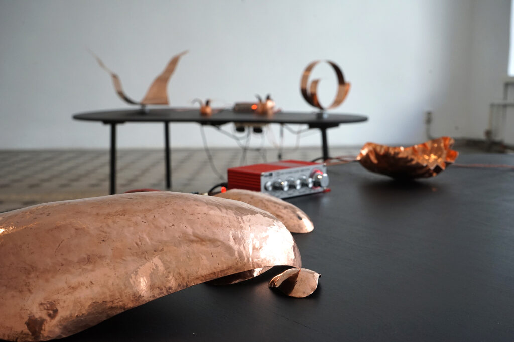 Eksponaate võib vaadelda ka pseudo-ajalooliste artefaktidena, mis viitavad eri etappidele vase kasutamise kümne tuhande aasta pikkuses ajaloos. Vaskplaadist haamriga taotud primitiivsed vormid on vihje ürgajaloolistele töömeetoditele. Vasksete juhtmete abil toimivad algelised ja ulmelise kujuga analoogsüntesaatorid juhatavad meid industrialiseerimise järgsesse maailma, mil vaske hakati kasutama tema elektrit juhtuvate omaduste tõttu. Tänapäeval masstoodanguna valmistatud ning inimest tööriistana teenivad juhtmed, kõlarid ja võimendid sisaldavad samuti mitmeid vasest komponente.