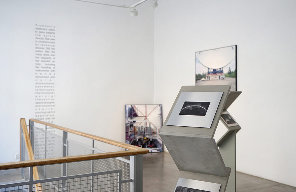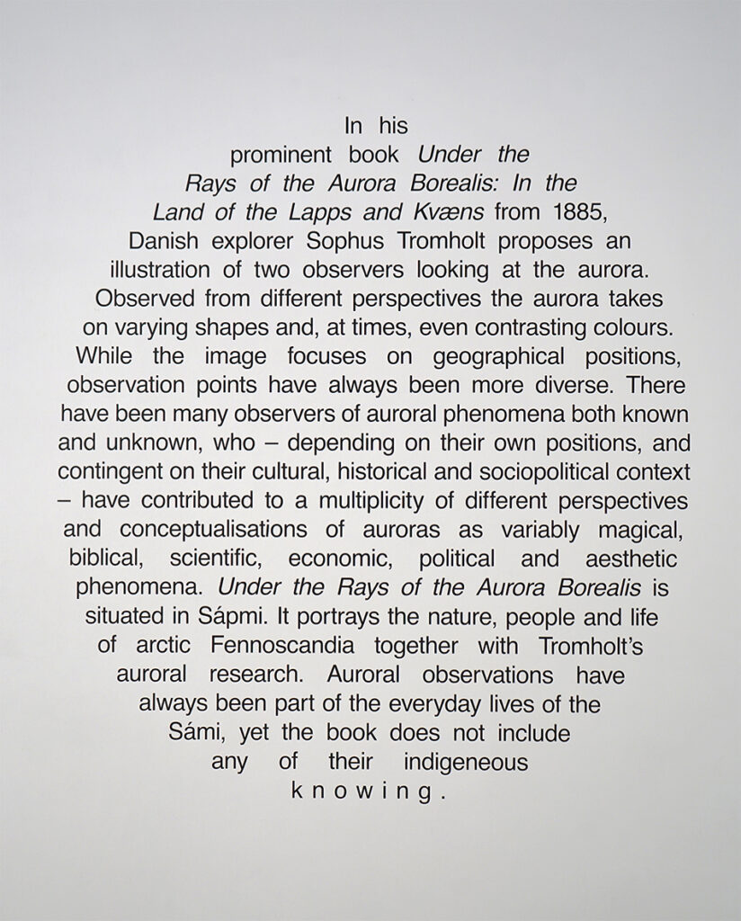 „Virmalistest geosfäärini“ käsitleb virmalisi kui kokkupuutepunkti kõrgemate atmosfäärikihtidega. Näitusel on autorid kombineerinud fotograafiat, ajaloolisi ning teaduslikke kujundeid, joonistusi, heli ja teksti. Kunstnikud on aluseks võtnud uurimisreiside ajal peetud vestlused teadlaste ja uurimistöö tegijatega ning lähtunud akadeemilistest ja ajaloolistest allikatest, nagu näiteks diagrammide mõju sellele, kuidas me tajume ääretuid, hoomamatuid ja samas nähtamatuid keskkondi. Teadusega seotud juurdunud arusaamad on alati ajalooliselt põhjendatud ning peaaegu alati osaliselt objektiivsed – ent see ei lihtsusta ega vähenda teadusliku tõendusmaterjali tähtsust, vaid hoopis loob võimaluse kaasamiseks. Seda rõhutavad käesoleva installatsiooni erinevad elemendid, mis toimivad fragmentaarse sõnastikuna – see omakorda pakub tõlgendamiseks erinevaid võtmeid, eeldamata hierarhilisi suhteid teadusliku, esteetilise, ajaloolise ja poliitilise vahel.