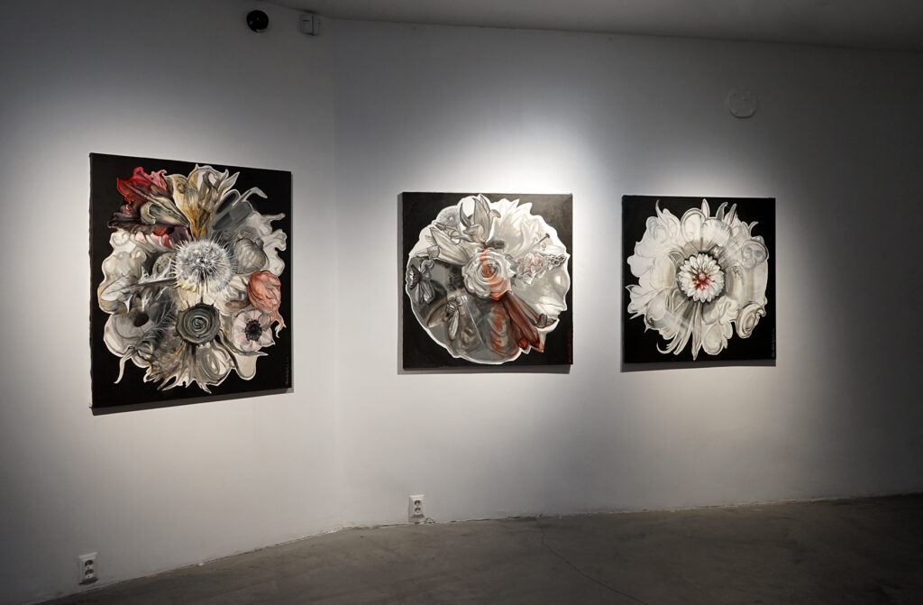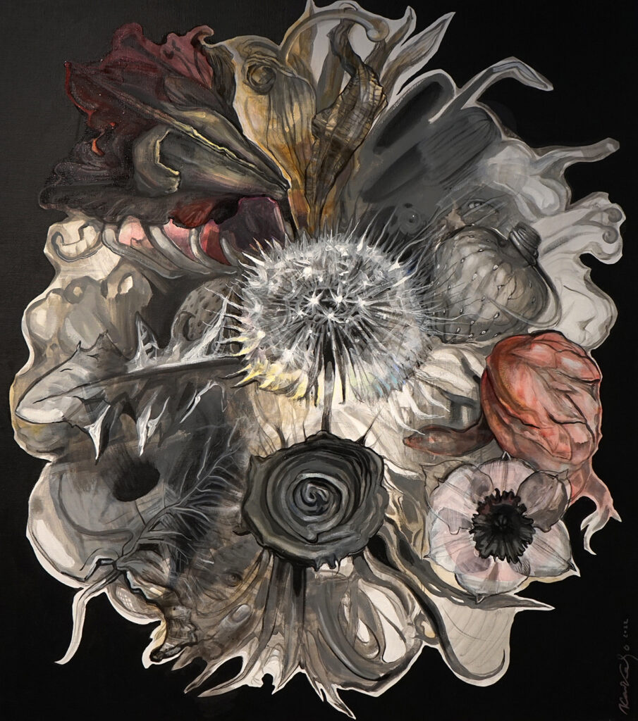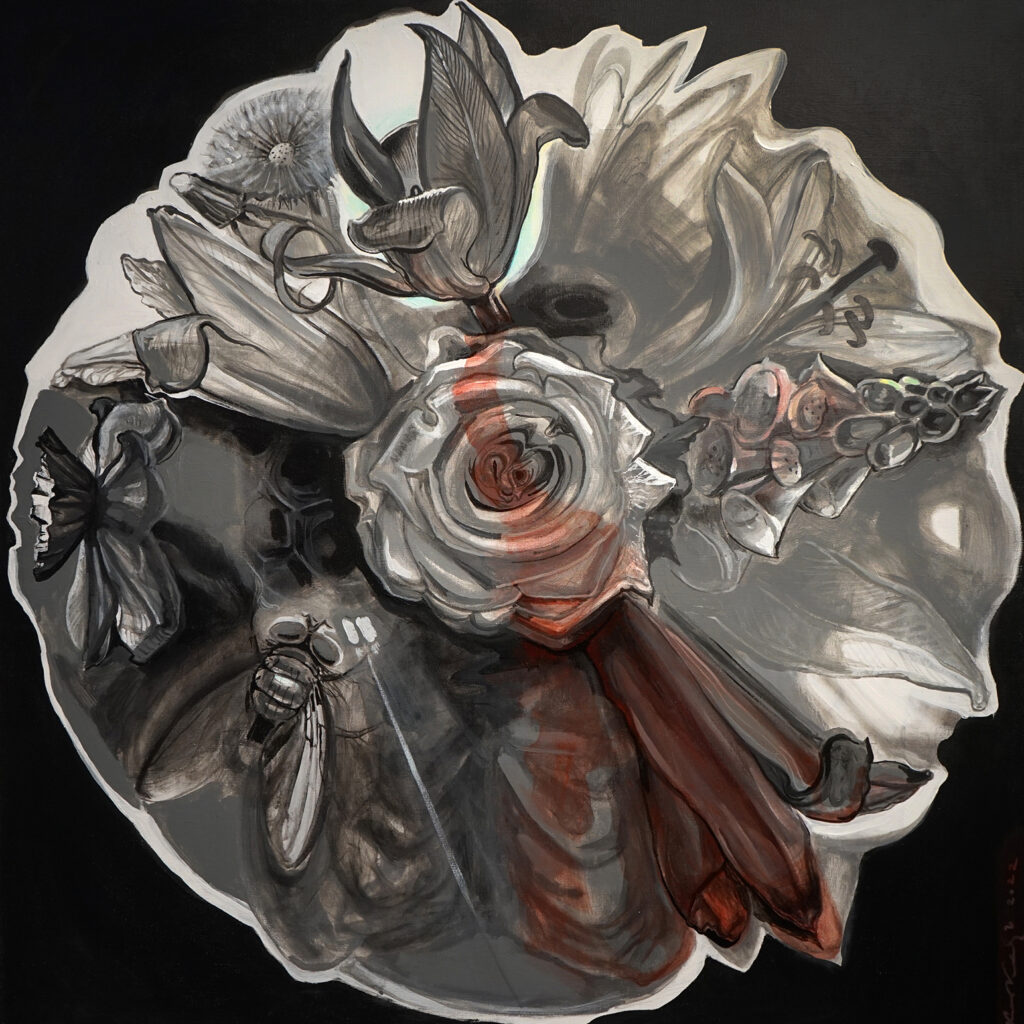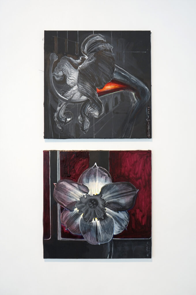 Kaks lille: esimene on nagu söestunud laip, mille sees, kõige suuremas veresoones on veel säilinud veidi verd. Töötasin kunagi kohtumeditsiini laboratooriumis, sealt saadud teadmised ujusid nüüd äkki pinnale. Teine lill on akna poole seljaga, kui akna taga plahvatab aatomipomm.